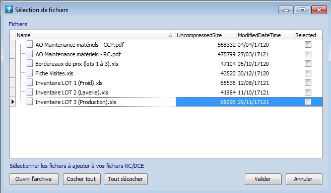Une fois le RC/DCE récupéré sur le site officiel, la liste des différents documents du dossier apparaît. Vous pouvez alors sélectionner les documents vous concernant pour les ajouter à l'espace RC/DCE de votre logiciel.